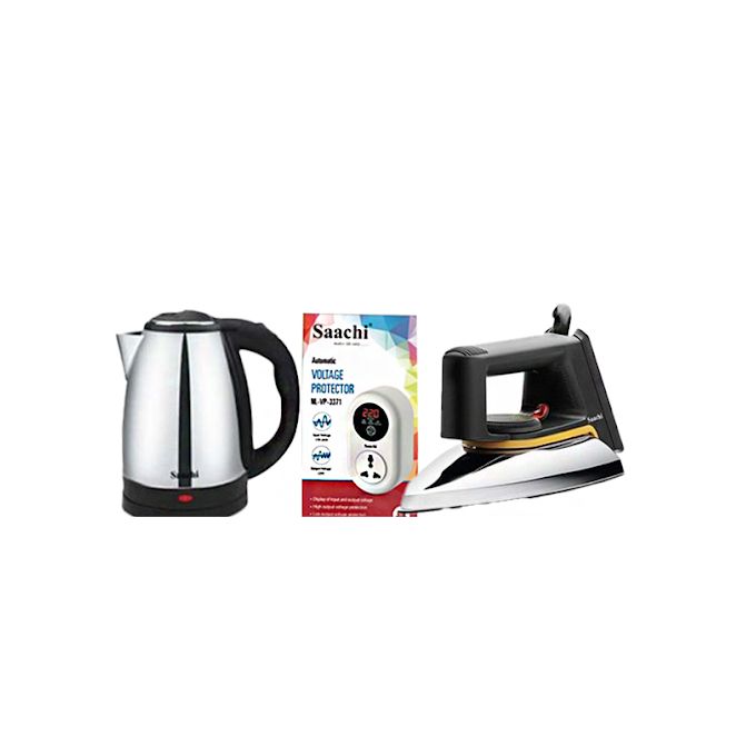 Saachi Non Stick Dry Flat Iron+Original 2L Stainless Electric Kettle+ 15 Amps TV Guard / Fridge Guard / Power Guard.